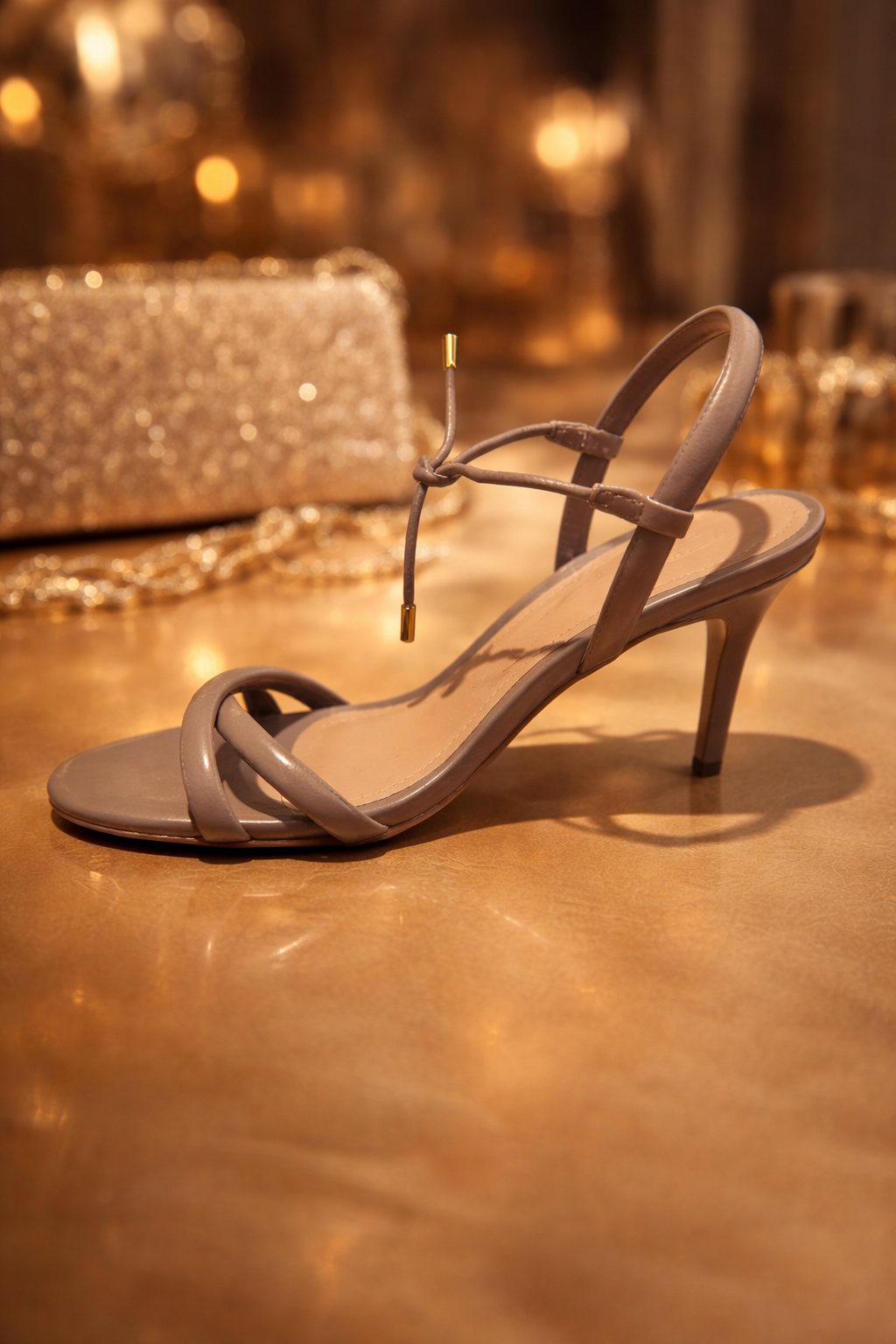 Sandália feminina em tom cinza com design minimalista e sofisticado. Possui tiras delicadamente torcidas no cabedal, fechamento ajustável no tornozelo com ponteiras metálicas douradas e salto fino que valoriza a silhueta com elegância. Versátil e moderna, é a escolha perfeita para looks refinados, do casual chic a produções noturnas mais elegantes.